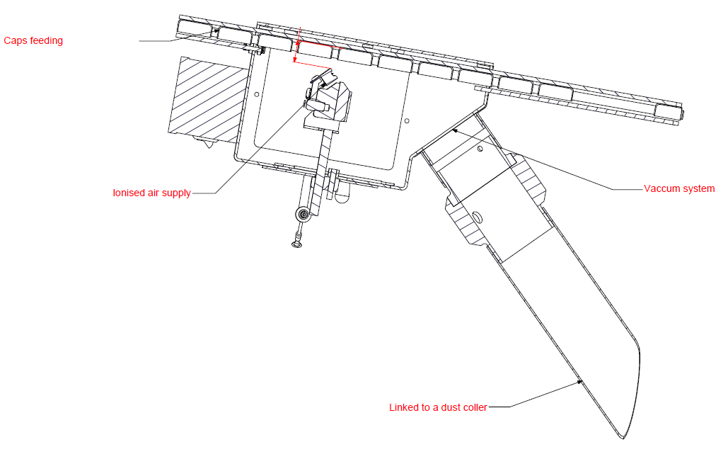 Now, this same end user is aiming to repeat the application, only this time for a larger cap. The setup is identical – the caps travel left-to-right on the conveyor track, they are blow off with ionized air from an EXAIR Super Ion Air Knife, and the dust is collected with a Light Duty Aluminum Line Vac. The only revision to this system (and retroactively applied to the last) was to reposition the Super Ion Air Knife so that the caps spend more time in contact with ionized air. This allows for increased throughput, should the application ever require increased production.